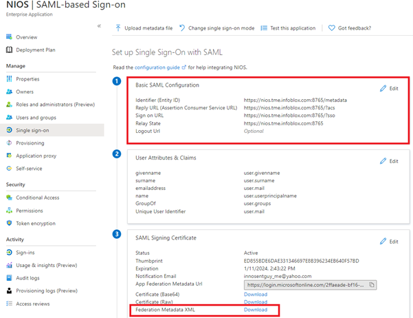Microsoft Azure now comes up with simplified view to ease configuration experience to set up SAML 2.0. Add the required information for your Infoblox vNIOS in “Basic SAML Configuration” and all you need is “Federation Metadata XML” from “SAML Signing Certificate” as highlighted below which will be used to configure Infoblox vNIOS.