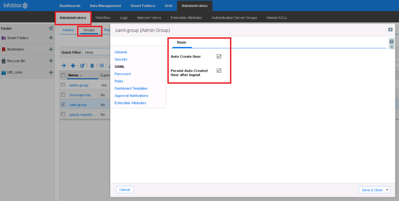 Infoblox supports Just-in-time user provisioning when users are authenticated using 3rd party IDP. To enable this simply edit “saml-group” properties as highlighted below.