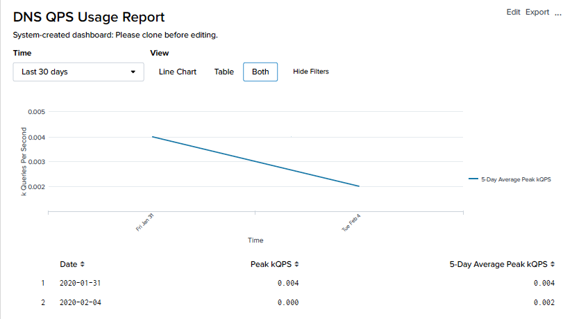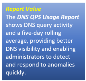 Located in the DNS Performance Dashboard, the DNS QPS Usage Report displays the five-day rolling average for the total peak DNS queries per second (kQPS) calculated for all members in the Grid.