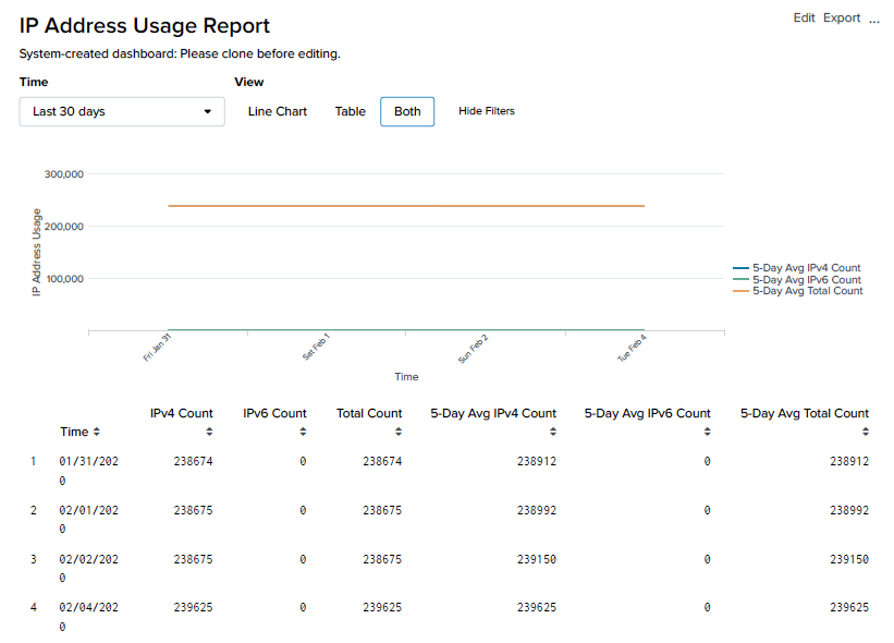 Appearing in the IPAMv4 Utilization dashboard, the IP Address Usage Report gives administrators a view into daily IPv4, IPv6, and total peak usage counts and a five-day rolling average of these IP address categories across all networks in the Grid. Further, if the same network is displayed in different network views, the IP address count includes all views.