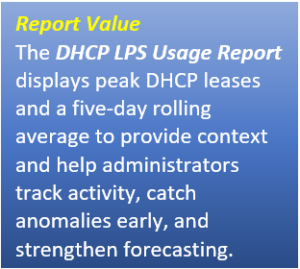 Found in the DHCP Lease Dashboard, the DHCP LPS Usage Report shows the five-day rolling average for total peak DHCP leases per second (LPS) for all members in the Grid. It’s calculated based-on 10-minute intervals, including both leased and renewed actions.