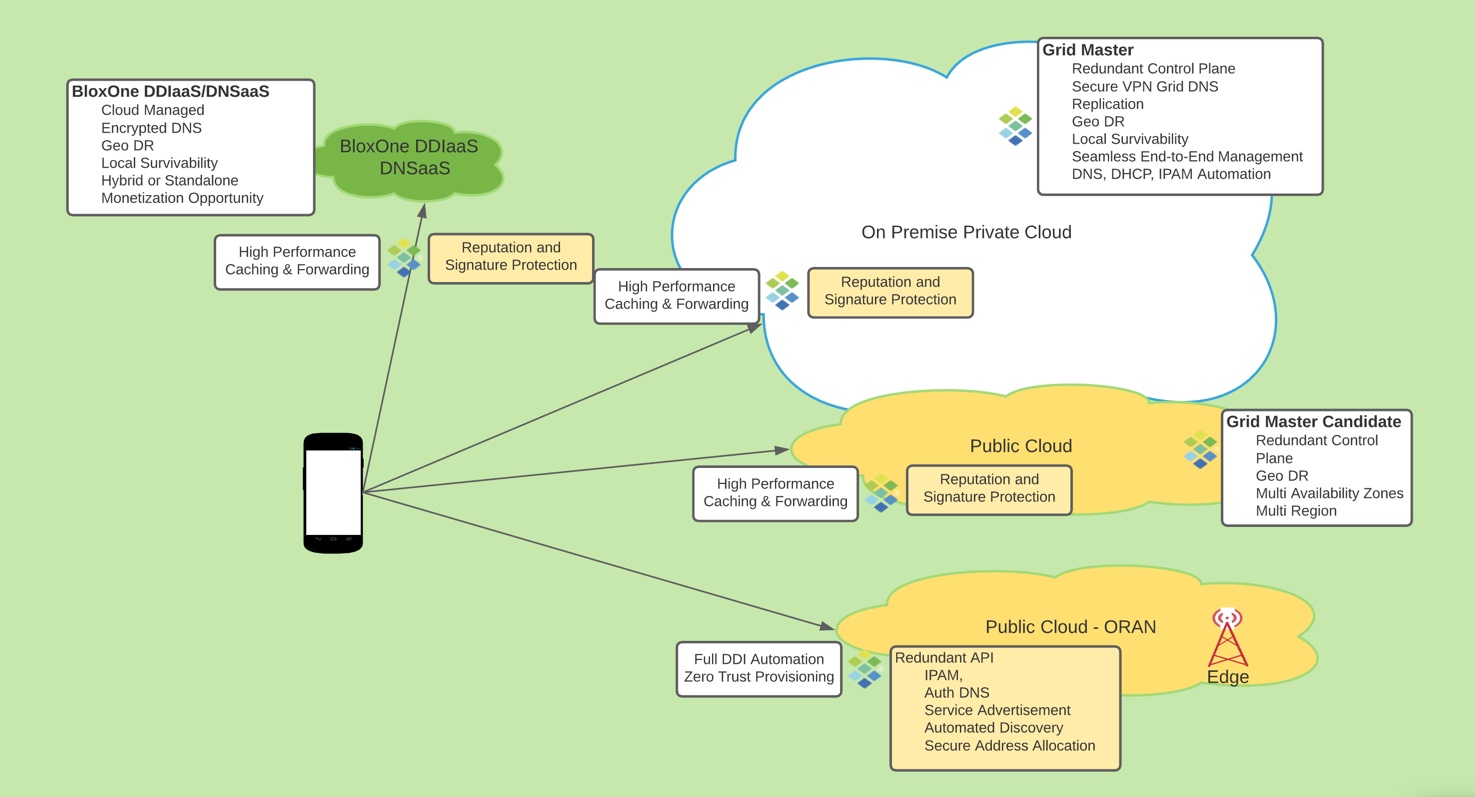 DDIaaS/DNSaaS: Infoblox recommends the BloxOne platform for Application Edge, Managed Edge, Private 4G/5G deployments. The BloxOne Platform is cloud managed and provides full DDI functions complete with all the advantages of a public cloud deployment. The BloxOne solution provides local breakout functions and insures maximum service availability either standalone or in conjunction with other deployment models such as on premise or hybrid.