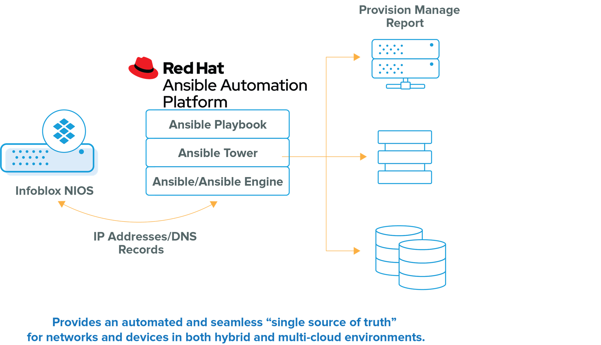 The Infoblox NIOS Collection for Ansible Automation Platform is a package of modules and plugins that allows managing Infoblox Network Identity Operating System (NIOS) objects and functions through APIs leveraging Ansible playbooks. Dynamic inventory is one of the powerful features in Red Hat Ansible Tower, which allows Ansible to query external systems and use the response data to construct its inventory. The combined Infoblox/Red Hat solution enables network professionals to overcome the burden of maintaining a static registry of devices and gain a centralized and highly efficient way to manage DNS, DHCP, and IPAM (DDI) automation of VMs and containerized workloads deployed across multiple platforms.