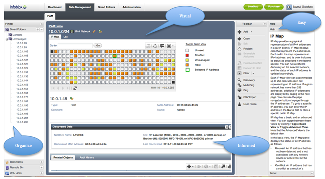 Visual tools such as the IP MAP are informative and assist in planning and management of your IP Address space. |
