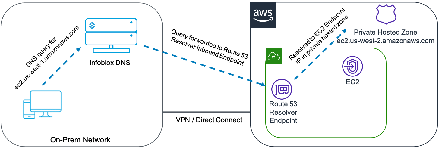 - EC2 instance or other client queries Infoblox DNS for ec2.us-west-1.amazonaws.com via Transit Gateway or VPC peering.