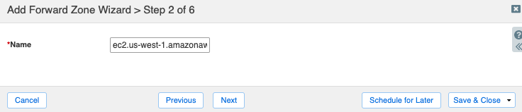 On step 2, enter the name of the zone for forwarding, in this case ec2.us-west-1.amazonaws.com. If you will be using interface endpoints for other AWS services in this region, you could instead use us-west-1.amazonaws.com to forward to Route 53 Resolver for all of these services.