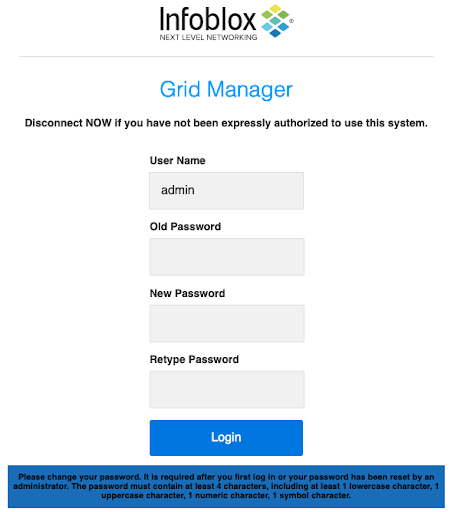 As an additional security measure, new Infoblox NIOS virtual appliances deployed in AWS require the administrator to change their password on the first login. The new password must meet default length and complexity requirements.