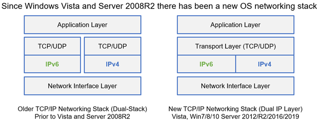 Also, for those running IPv6-only networks, you have additional considerations. There is one issue with IPv6-only (or IPv4-only networks) and Windows. Windows has a dual IP layer design for its network stack.