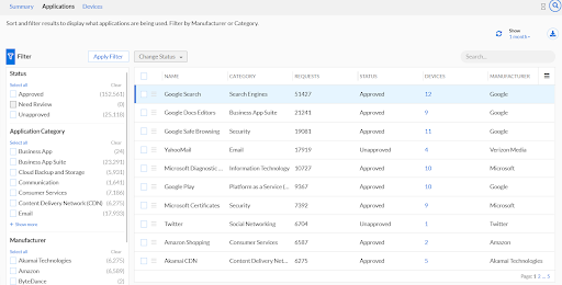 On the Applications tab we can drill down into the data that was summarized on the Summary tab. On this page we can filter based on the status of the application, the application category, and manufacturer of the application. For each individual application we can view its name, category, amount of requests made, status, devices that have accessed it, and the manufacturer.