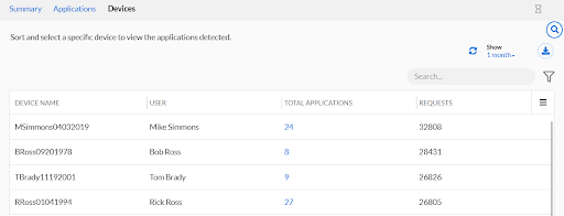 Finally, the Devices tab allows us to see a breakdown of each device’s application usage.