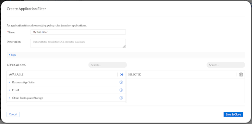 On this page we can see a couple predefined Application filters: All Approved Applications and All Unapproved Applications. As you’d guess, these filters are populated with the approved and unapproved applications from BloxOne’s Application Discovery.