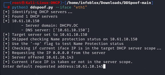 The tool searches for DHCP servers on the local area network via the IPv4 broadcast address, 255.255.255.255. When a server is found, it steps through the DHCP DORA process (Discover, Offer, Request, Acknowledge), which allows for the automatic assignment of IP addresses to clients that request them. When DDSpoof discovers a DHCP server on our network, it asks us what our desired IP address is.