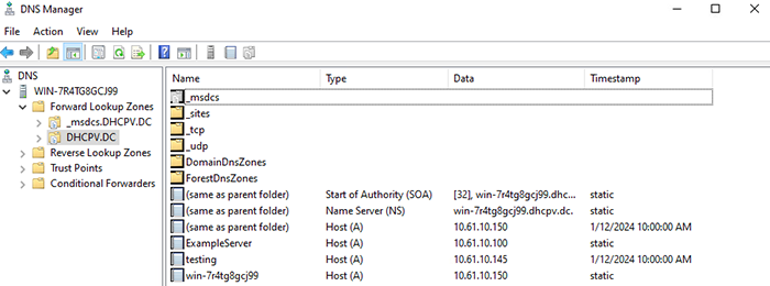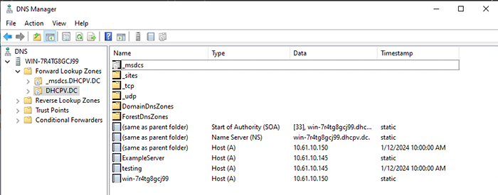 By checking the Windows Server DNS Manager, I can see that an A record for the name ‘testing’ was created as requested.