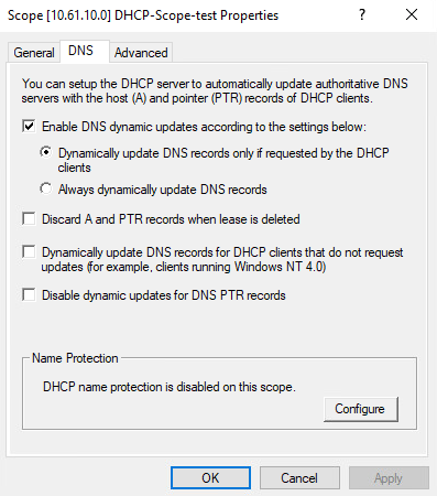 I’ve deployed a new, unprovisioned, Microsoft Windows Server 2022 in my lab and tested this feature of the Microsoft DHCP Server. It’s shocking how easy it is to rewrite records—any record, whether belonging to a server, random PC, or the Domain Controller itself. Let’s look at a couple common configuration issues found with the default settings on my new Microsoft server. In the screenshot below, we can see an option to configure Name Protection. Enabling Name Protection adds some security, preventing a record for one device from being overwritten by a different device. Unfortunately, it is disabled by default (and often left that way), as in the screenshot below.