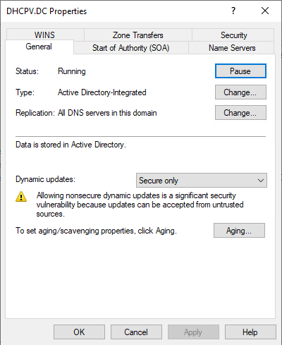 Furthermore, in Microsoft Server’s DNS settings, a setting named Dynamic Updates is set to Secure only by default. The text below this setting could mislead IT professionals into thinking that setting this setting as Secure only would offer name protection of DNS records by other clients, however, this is not the case. When set to Secure only this setting only allows authorized clients to make changes to a zone or record; that said, it doesn’t matter which record is being changed. In this case the authorized client is the DHCP Server itself; therefore this setting does nothing to protect records in this use case.