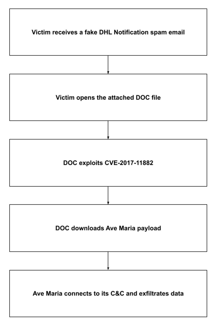 Opening the attached DHL_AWB_INV_PL_BL.doc launches an exploit of CVE-2017-11882: a vulnerability in Microsoft Equation Editor. The file then downloads and executes falcadhgy.exe, the Ave Maria payload. Ave Maria then connects to its C&C and sends it the stolen credentials.