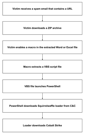 After extracting and opening the downloaded file, the victim is prompted to enable content. If the victim complies, the content runs a macro, which executes a VBS file via cscript.exe. This VBS file contains an obfuscated PowerShell script, which attempts to connect to one of several command and control (C&C) sites. Upon connecting, the script downloads Squirrelwaffle in the form of a DLL file: a loader that attempts to download Cobalt Strike.5