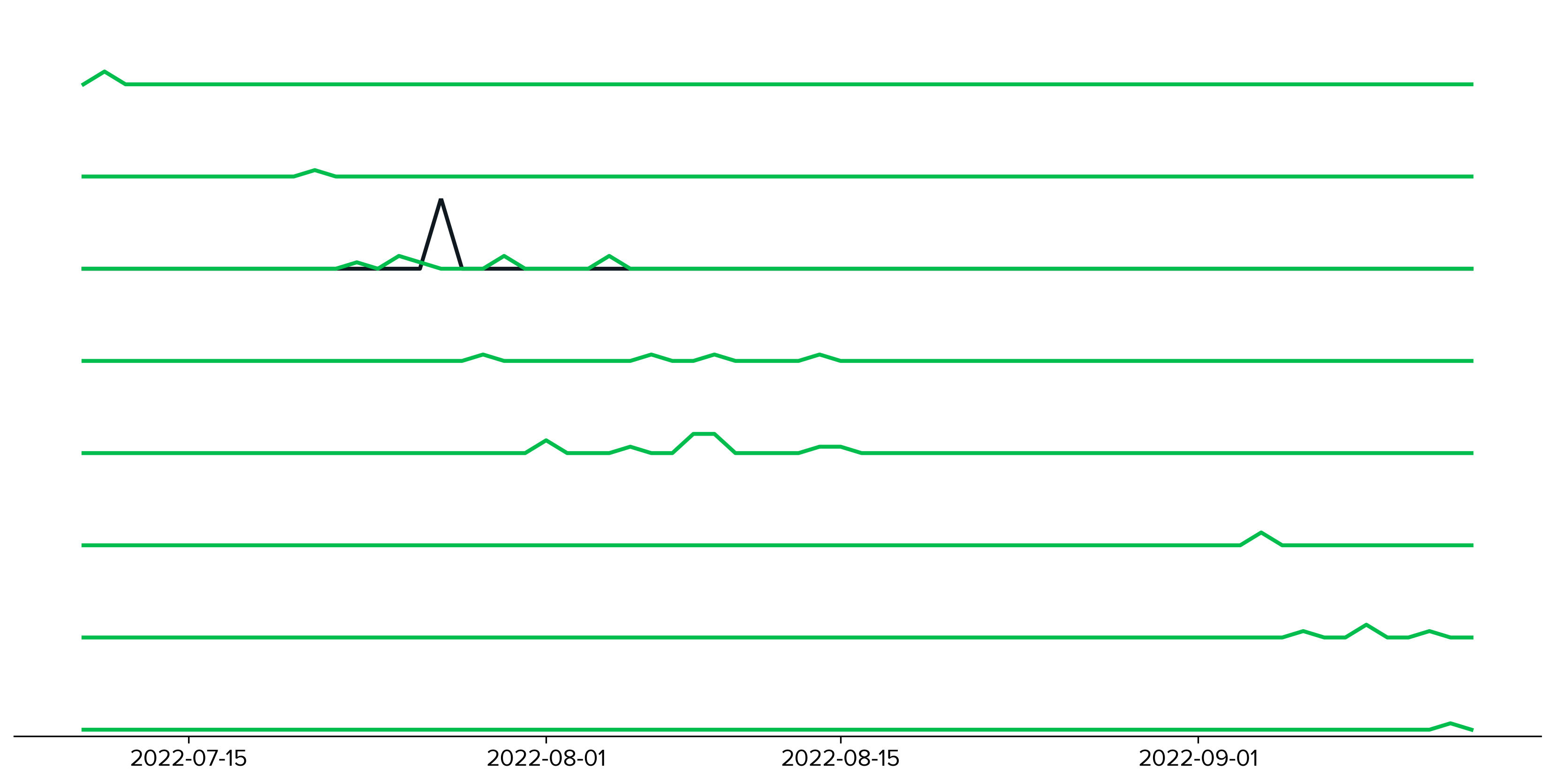 Figure 5. Timelines of the number of DNS requests over a two month period in a single sample network. Each line represents a query for a single FQDN with green denoting successful queries (maximum: 3/day) and black unsuccessful queries (maximum: 11/day).