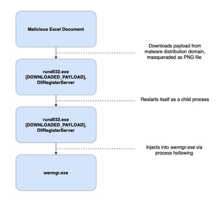 Sandbox analysis7 shows that an Excel macro downloads the Trickbot payload, which masquerades as a PNG file from a malware distribution domain. Next, it executes the Trickbot payload via rundll32.exe. This executable already exists by default on Windows systems and is not dropped by the Excel document or the packer. The rundll32.exe process spawns a child process of itself that masquerades as a legitimate Windows tool but that injects the Trickbot payload into the 64-bit version of the Windows Error Reporting tool wermgr.exe via process hollowing.