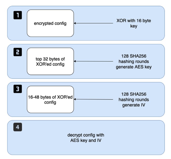 The AES key is generated by taking the top 32 bytes of the XOR’ed config buffer and copying it into a separate buffer. Next, the malware generates a SHA256 hash of the 32 bytes and appends it to the end of that same buffer. The malware continues to generate SHA256 hashes of the whole buffer and appends the new SHA256 128 times. The final generated hash is the AES Key. In Figure 5 below, we provide a graphical overview of the configuration decryption routine. In the bottom box of the diagram, “IV” is an abbreviation for the custom initialization vector used for decryption.