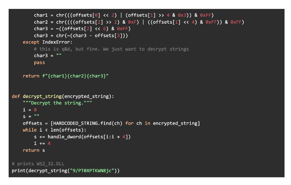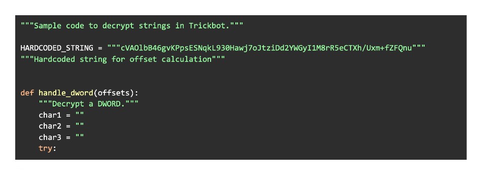 Trickbot uses string encryption, and so to support other researchers, our full report includes a script to decrypt strings embedded in the sample we analyzed.