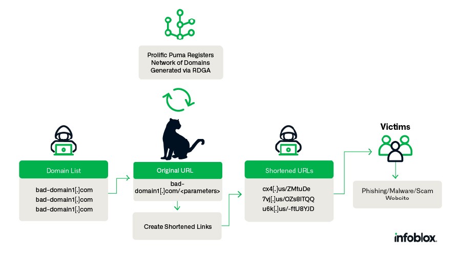The cybercrime economy is the world’s third largest, with an estimated $8 trillion value in 2023, and Prolific Puma is part of the supply chain.1 They create domain names with an RDGA and use these domains to provide a link shortening service to other malicious actors, helping them evade detection while they distribute phishing, scams, and malware. When we disrupt Prolific Puma, we disrupt a larger segment of the criminal economy. Figure 1 is an overview of the Prolific Puma operations and how they enable criminals. Prolific Puma generates large volumes of domains algorithmically, and then they use these domains to generate shortened links for other malicious actors, allowing them to hide their true activity.