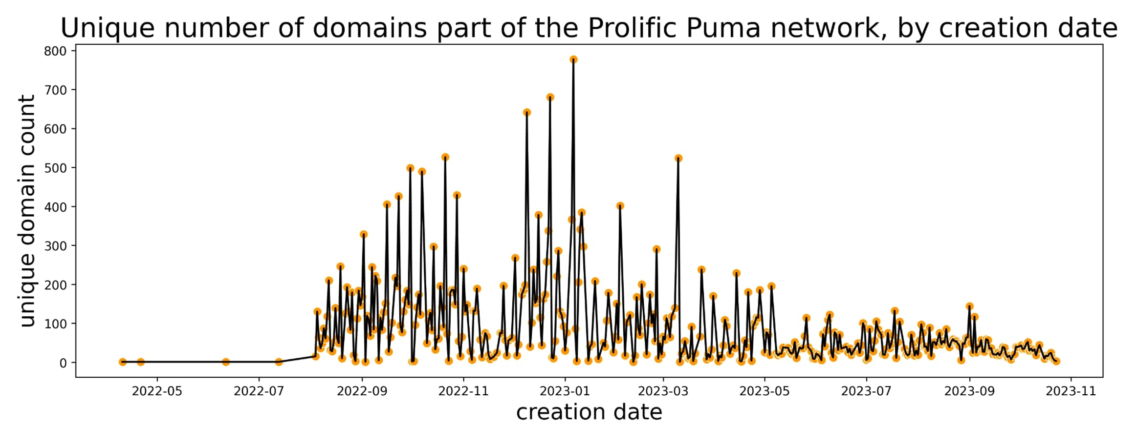 Prolific Puma domains are alphanumeric, pseudo-random, with variable length, typically 3 or 4 characters long, but we have also observed SLD labels as long as 7 characters. The domains are registered on 13 TLDs that are frequently abused by malicious actors, including: info, us, site, in, link, me, cc, website, life, xyz, club, buzz, and best. The infoTLD accounted for the bulk of domains until May 2023. Since then, the actor has used the usTLD for approximately 55% of the total domains they created. We observe 43 new domains, on average, every day since May 2023.