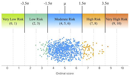 These ordinal scores are used to assign labels that simplify analysis. One would expect about 68% of all data to be within one standard deviation of the mean, so the scores of four, five, and six are all labeled as “Moderate Risk”. Scores of two and three are labeled as “Low Risk”, since data with these scores are 2-3 standard deviations below the mean. In the TLD use case, the TLD .edu had a score of three (3) for the month of August 2022, meaning it had far fewer observed malicious domains relative to the total number of domains than other TLDs. On the other end, scores of seven and eight are labeled as “High Risk” since data with these scores are two to three standard deviations above the mean. For example, the TLD .click had a score of 7 for the month of August 2022 since it had a far higher percentage of malicious domains than most of the other TLDs.
