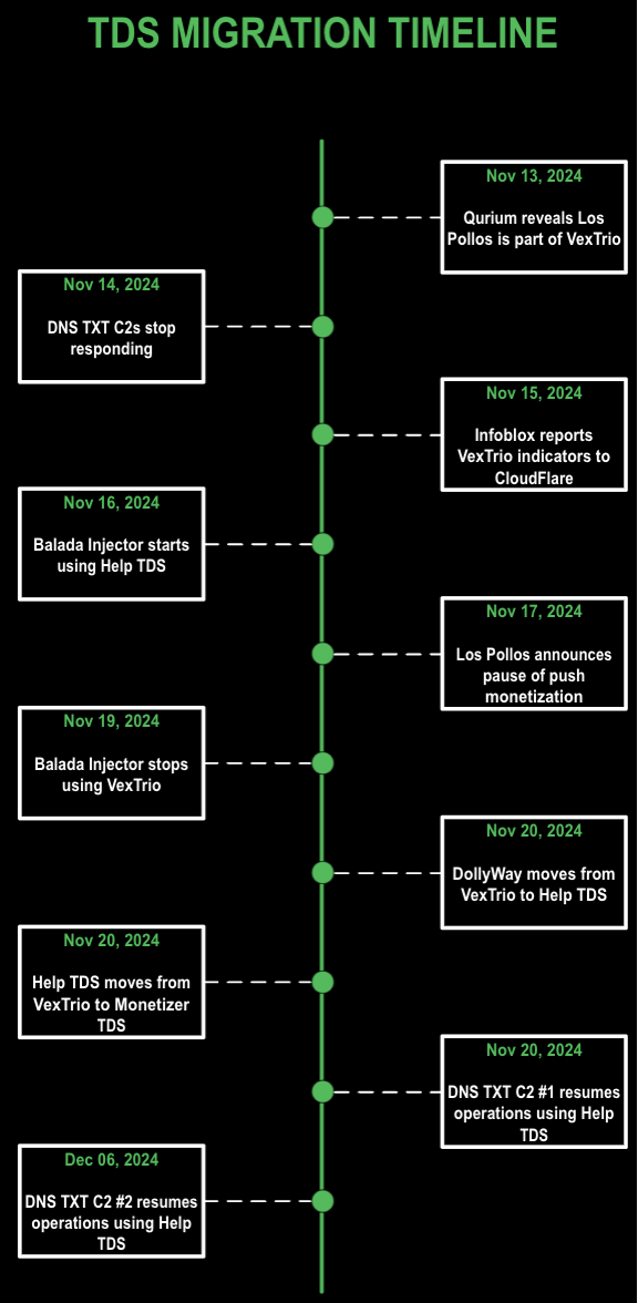 In a longitudinal study of DNS TXT record queries and responses over six months, August to December 2024, we assessed how the Los Pollos decision to halt their “push monetization” offering impacted the malware operations. The last date we observed a TXT record response that led to VexTrio was November 21, 2024, after which they redirected victims to the Help TDS. We focused on three major questions about the threat actors deploying the DNS TXT record malware: