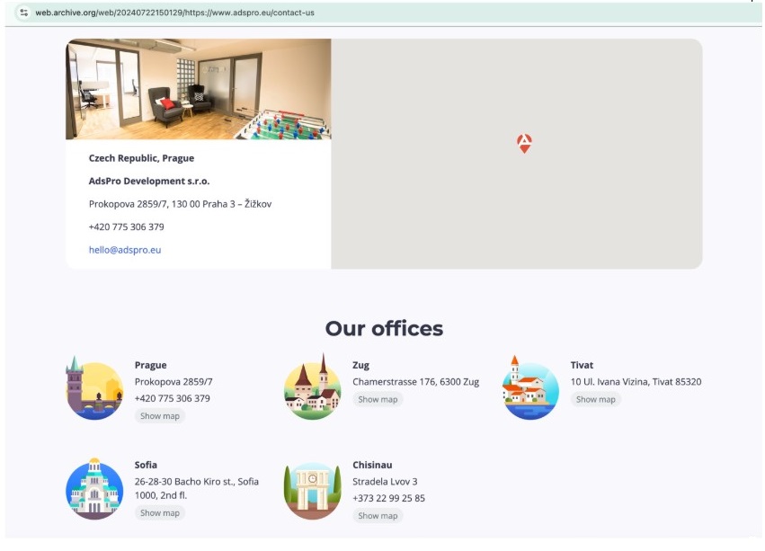 Figure 1. AdsPro office locations in July 2024 according to their website. Following public disclosure of AdsPro as part of VexTrio in December 2024, someone successfully had the company domains excluded from the Internet Archive project. Captured December 2024.