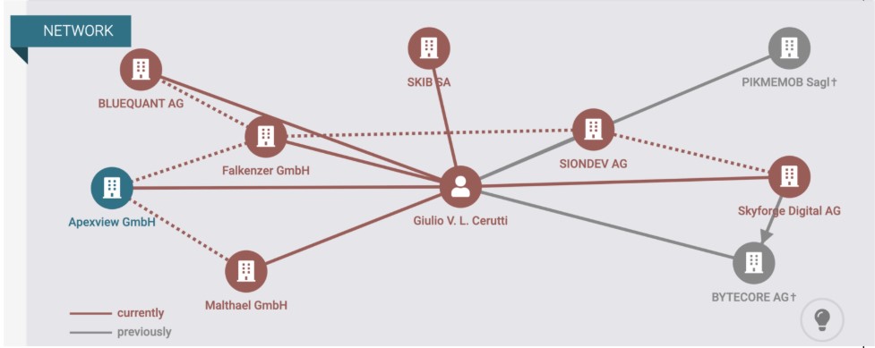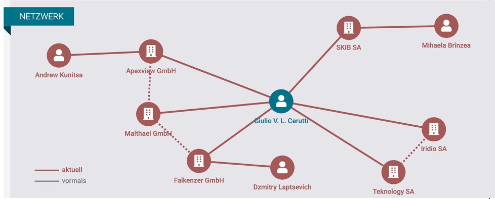 Figure 10. Business connections of Giulio Cerutti according to North Data in July 2025; Cerutti is connected to Andrew Kunitsa via Apexview GmbH, Igor Voronin via Malthael GmbH, and Dzmitry Laptsevich via Falkenzer GmbH.