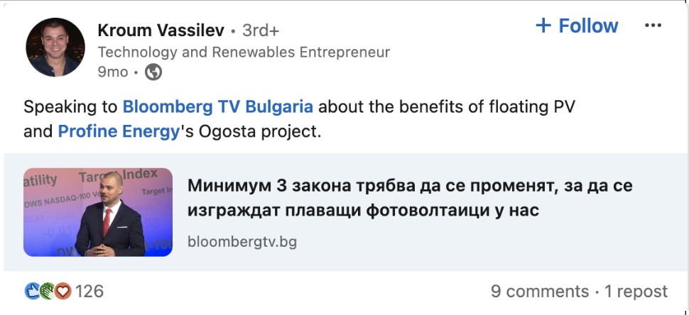 Figure 11. Kroum Vassilev posted on LinkedIn to announce a speaking slot on Bloomberg TV Bulgaria. Captured November 2024.