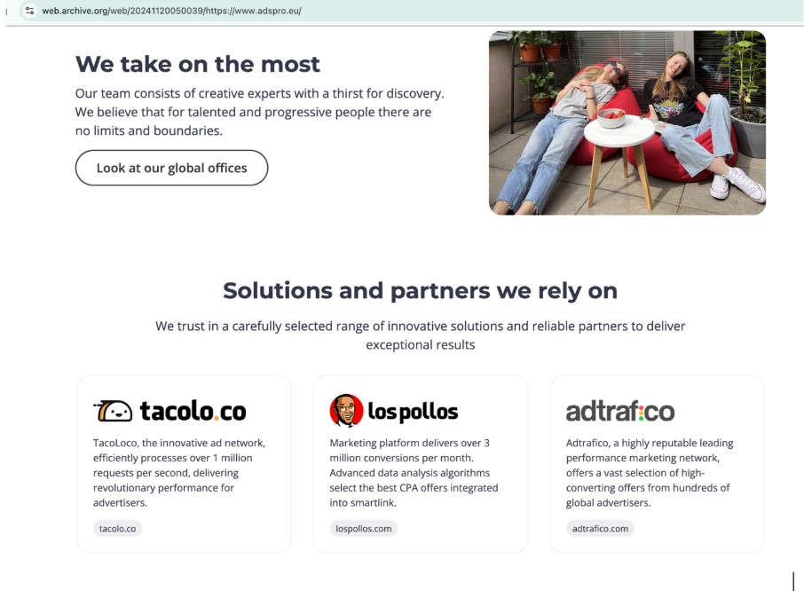 Figure 15. The AdsPro website as it existed November 20, 2024, shows TacoLoco, LosPollos, and Adtrafico. While it says these are solutions and partners, AdsPro owns all three. These entries in the Internet Archive were deleted in December 2024, due to a complaint from the domain owner.