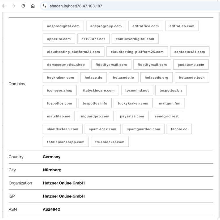 Figure 18. Shodan information for the IP address 78[.]47[.]103[.]187 shows several VexTrio company domains and app names. Image captured June 2025.