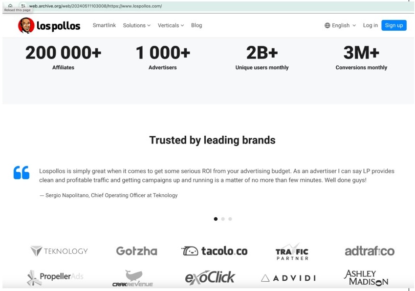 Figure 2. The Los Pollos website in May 2024, as recorded by archive.org, claimed 2 billion unique users. Several of the testimonial brands listed on the site, including Teknology, tacolo[.]co, and Adtrafico are part of VexTrio.
