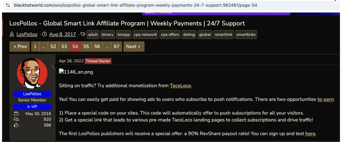 Figure 23. Advertisement for and explanation of, TacoLoco, the VexTrio push monetization company. By combining LosPollos smartlinks with TacoLoco, they promised a 90 percent revenue share to affiliates.
