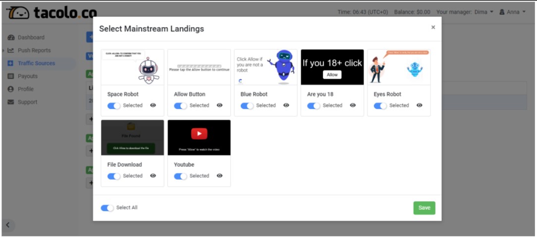 In their (now-deleted) “complete guide” blog, TacoLoco showed several pre-made landing pages that were available to affiliates. These landing pages are fake CAPTCHAs and considered within the security industry to be signature VexTrio images; see Figure 25. The blog also explains to affiliates how to set the “aggression” parameter, which controls how many times a user will be asked to subscribe to notifications. The article states: “Simply put, if a user opens a page, sees a push notification, but does not subscribe, then auto-update is triggered, and on another page, a pop-up window will offer to subscribe again.”