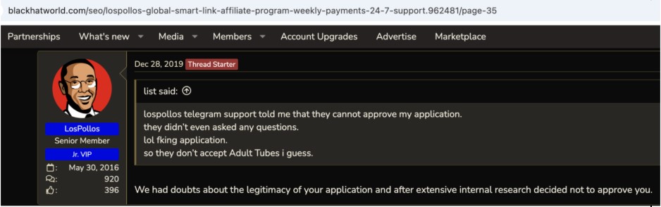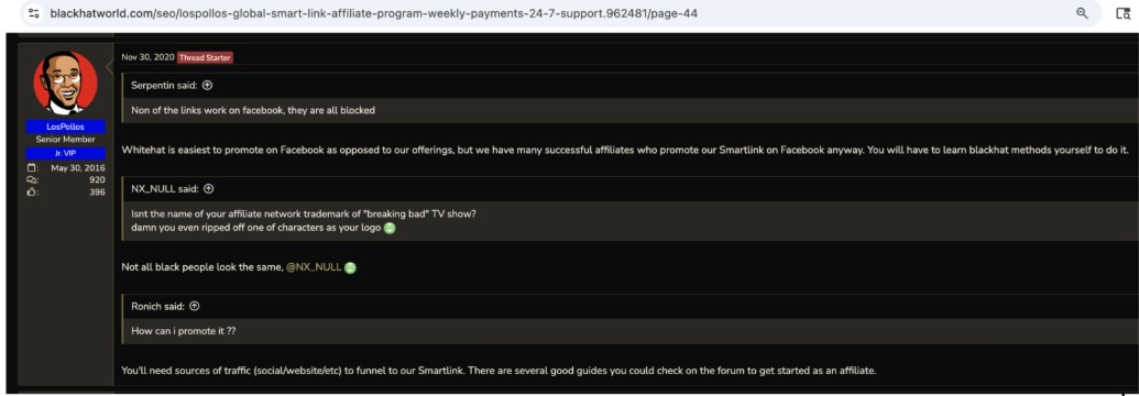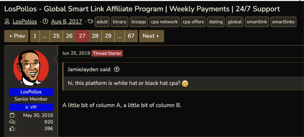 The available evidence strongly suggests that VexTrio is complicit in cybercrime. They boast about the quality of their advertising affiliates. Unlike Facebook and other major advertising platforms, Los Pollos does not allow just anyone to advertise: they vet their advertisers. We, and many others, have followed hundreds of smartlinks and been willingly scammed time and time again. The million-dollar question is: Are they complicit in the scourge of WordPress malware that plagues sites globally? According to a message from their official account on Black Hat World in 2017, their platform is a little black, a little white. See Figure 26.