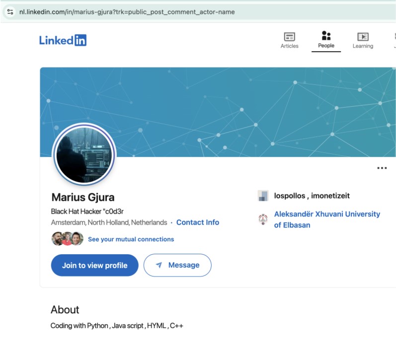 Figure 28. LinkedIn profile for self-described black hat hacker claims relationships with Los Pollos and iMonetizeIT. This same individual is linked to a different Albanian LinkedIn profile.