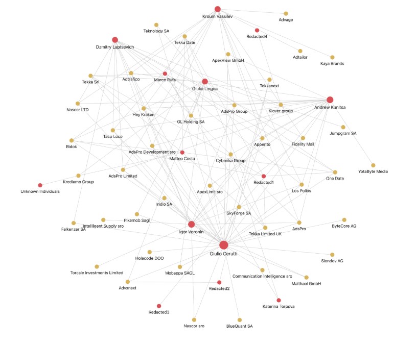Figure 7. Chart from North Data showing the relationship between AdsPro Group, other entities, and individuals. Voronin, Kunitsa, and Laptsevich were listed as directors when this image was captured in November 2024. This chart also shows K. Toropova, who is connected to a VexTrio advertiser, Techintrade. Voronin and Kunitsa are named in official records for AdsPro.