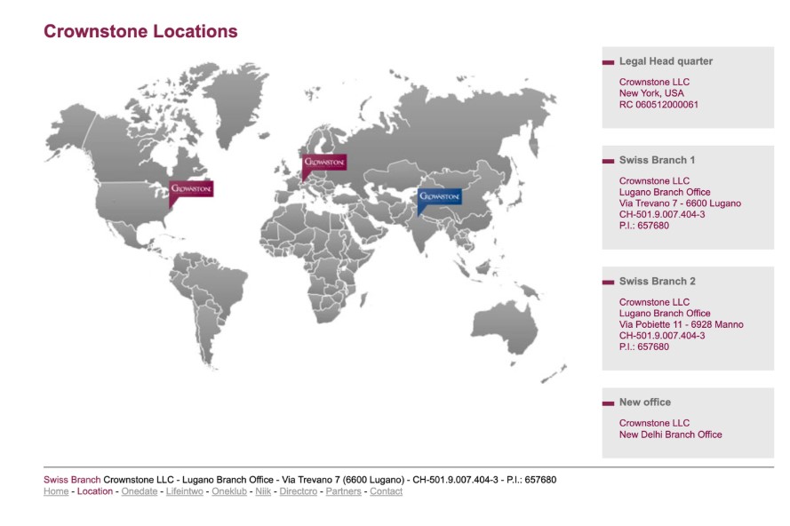 Figure 4. A historical record of the Crownstone LLC website, showing locations in New York City and Lugano. This site also identifies several of their key brands: Onedate, Lifeintwo, Oneklub, Niik, and DirectCro.