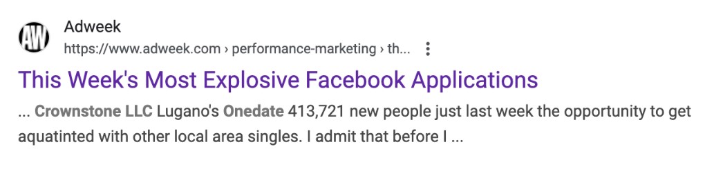 Crownstone dove deep into dating apps as Facebook took off and at one point had one of the fastest growing apps on the platform; see Figure 5. The primary brand Onedate took off in the mainstream, charging nearly twice what match[.]com did for membership in 2009, and they established several variants. Marketing reports indicate that Ondate was a top 20 Facebook app in 2012 by monthly active users.